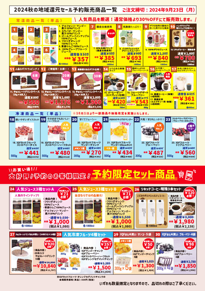 ドリンク、デザート食材を製造・販売する業務用食材メーカーの直営店にて秋のセールを開催します!